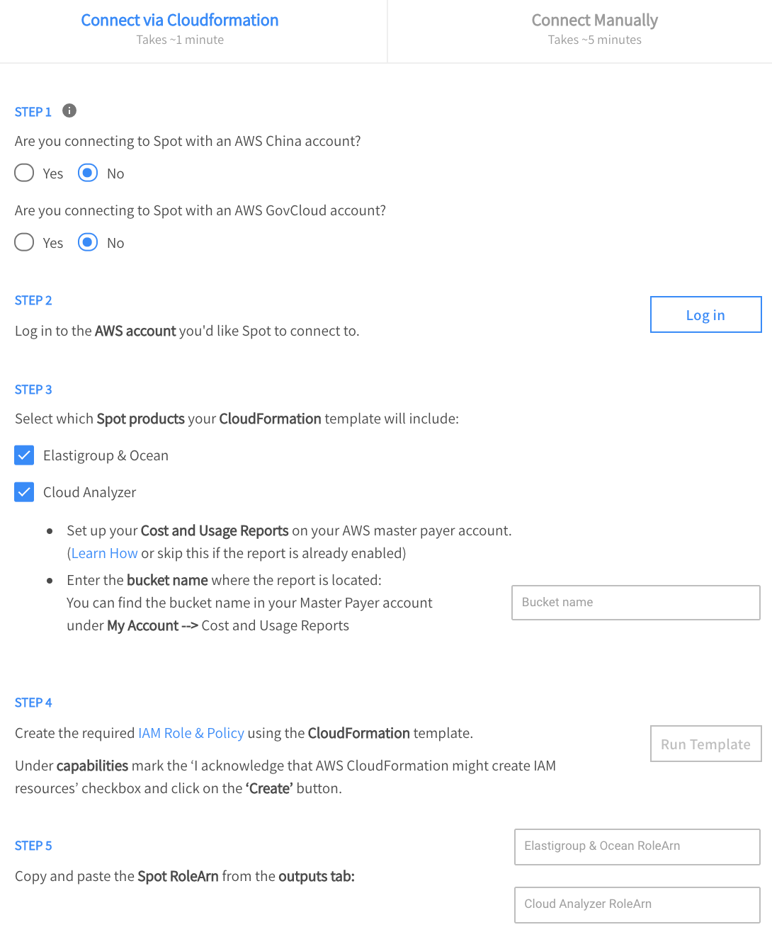 Complete the steps as shown in the online form. The example below shows the form for a new Spot customer. If you have already connected Cloud Analyzer or Eco, the form will be shorter than the one below.