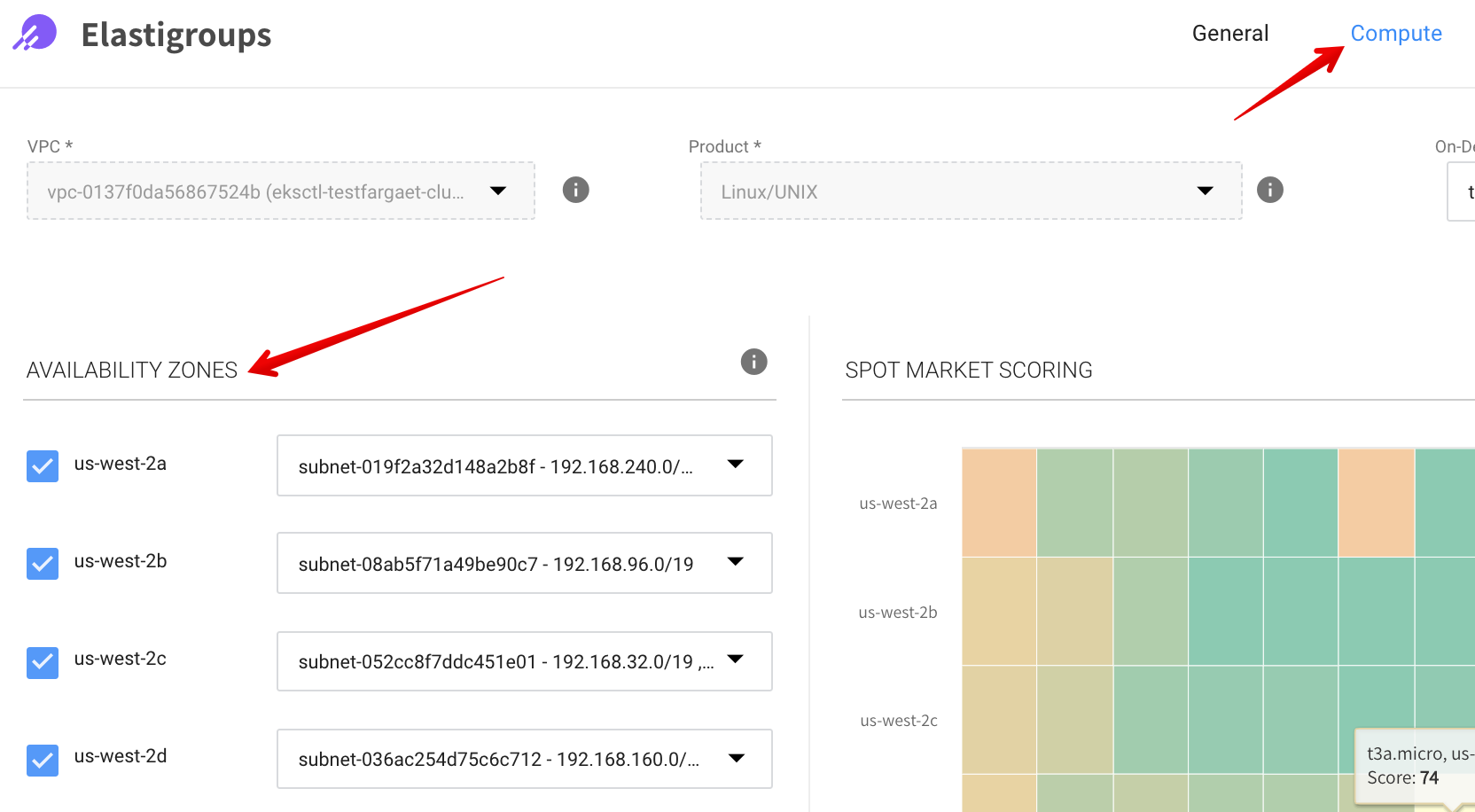 2. In the Compute tab, go to Availability Zones. (If you are creating a new Elastigroup, you must complete the required information in the General tab before you can enter the Compute tab.)