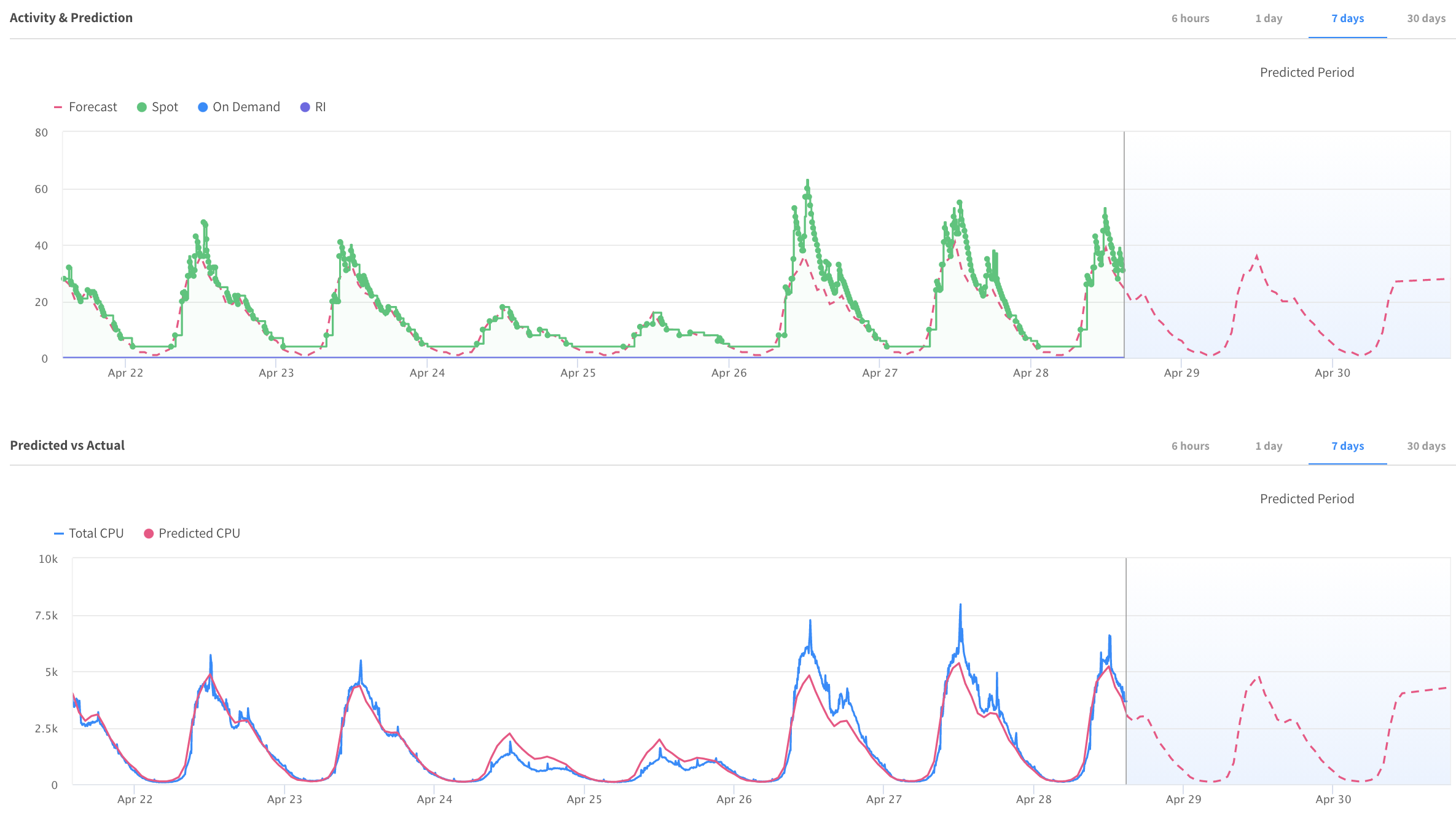 After you enable the scaling policy with predictive autoscaling, additional graphs will appear in the Elastigroup Overview page that show Activity & Prediction.