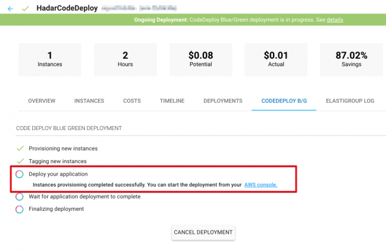 Elastigroups with Code deploy integration offers an option to utilize the B/G deployment mechanism. The Elastigroup will provision new instances in the Elastigroup with 'green' tags (user configurable) after the Tags are added to the instances, the user may start the deployment from AWS Code Deploy console. Once completed, Elastigroup will detach the old, 'blue' instances.