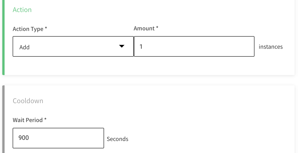 • Wait Period: After a scaling action, there will be no new scaling action until this amount of time (seconds) has passed.
