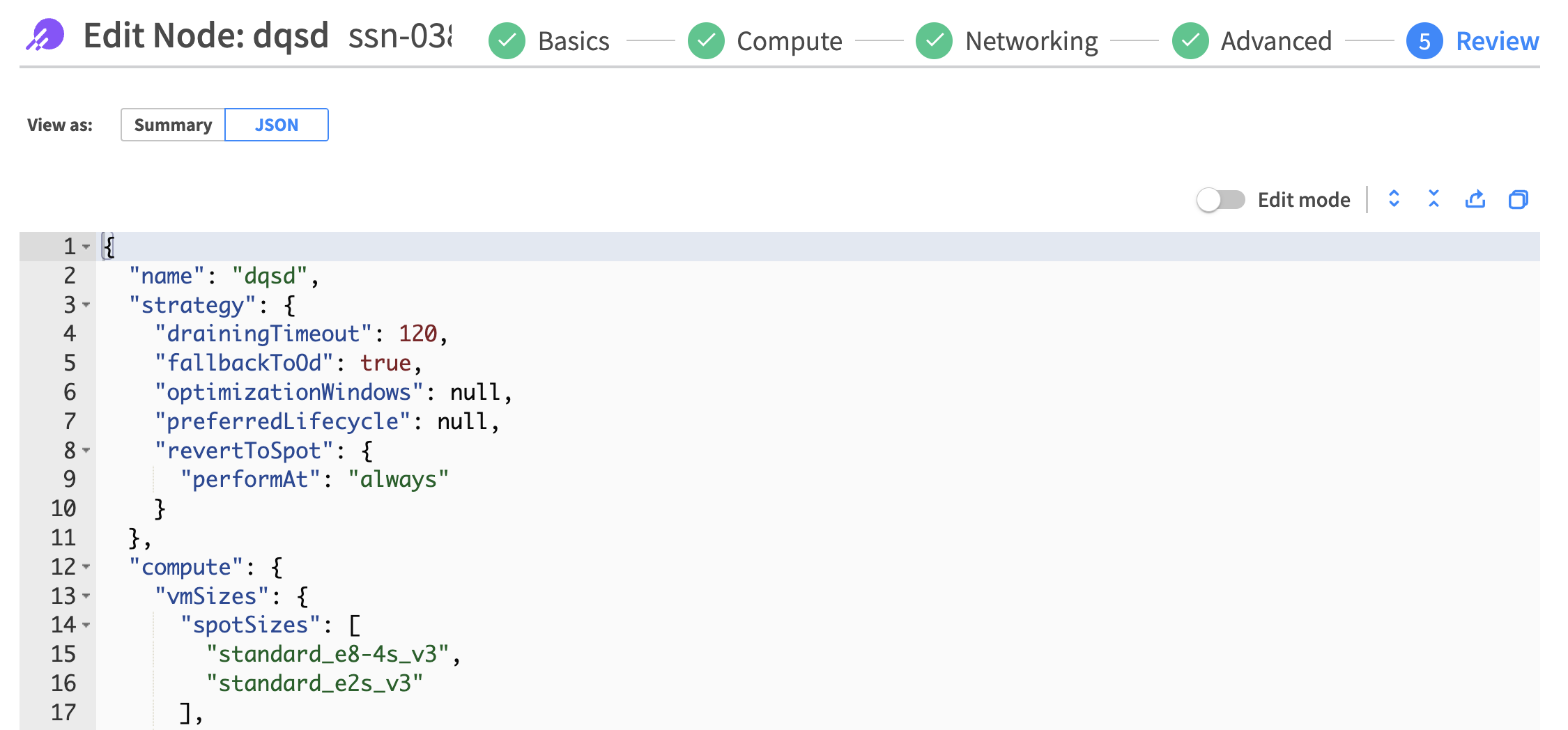 On the Review page you can edit directly in the JSON configuration.