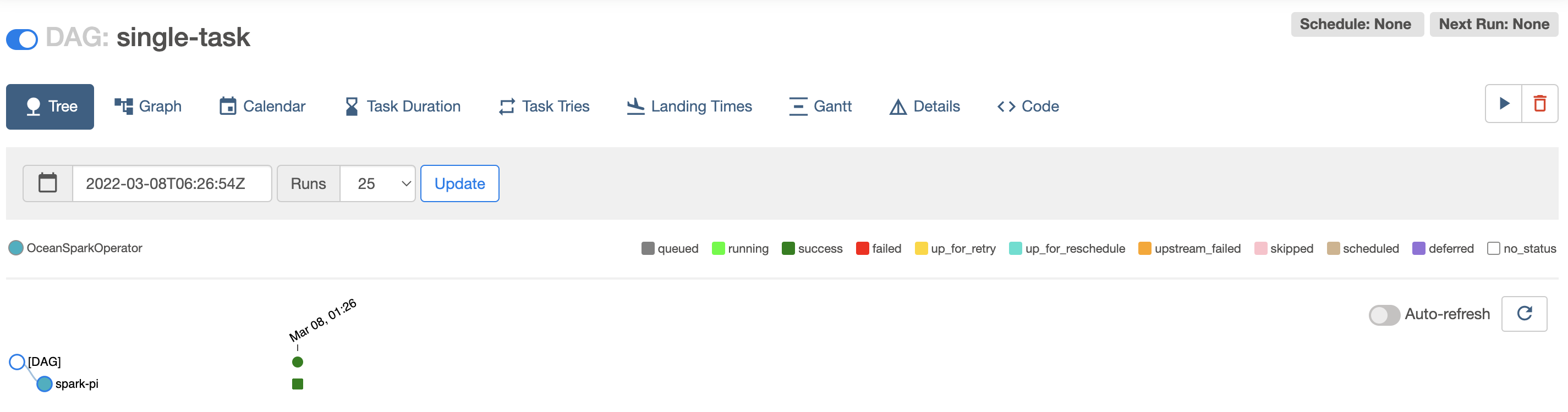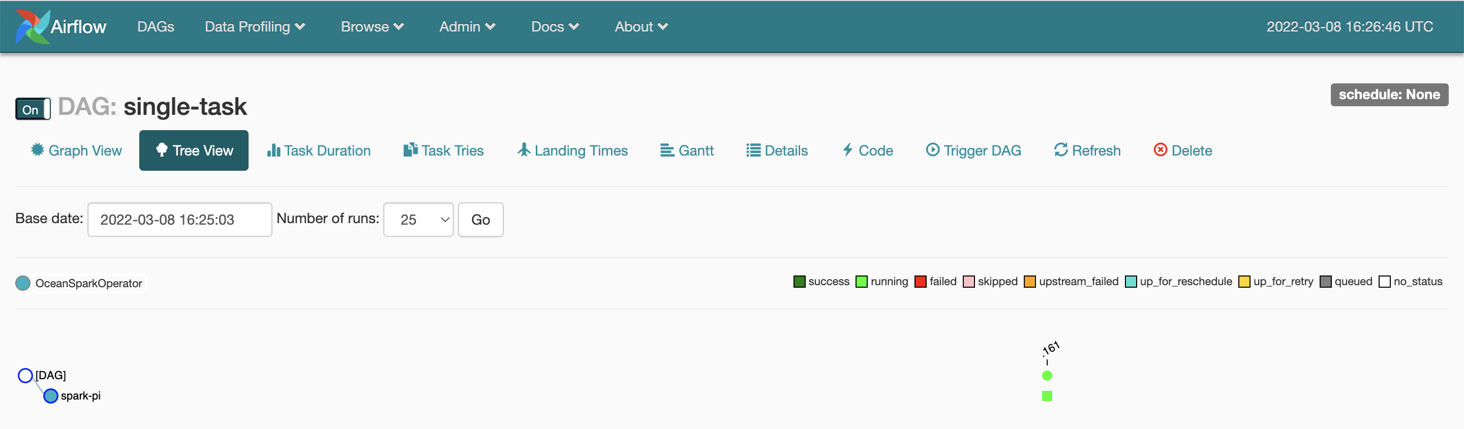 The example file below defines an Airflow DAG with a single task that runs the canonical Spark Pi on Ocean for Apache Spark.