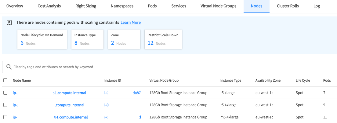 Once you have defined scaling constraints, you can view summary and detailed information about which pods have constraints applied, which nodes are affected, and exactly which constraints are used.